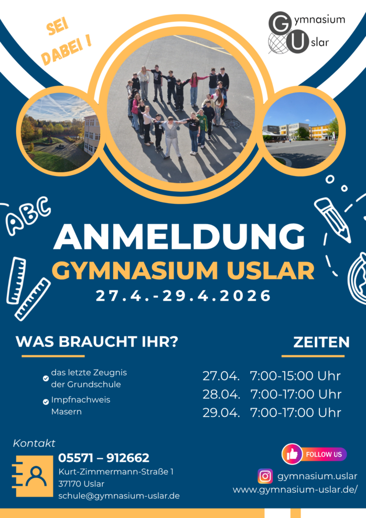 Das Gymnasium Uslar ist eine Schule mit einem weiten ländlichen Einzugsbereich, der neben dem Stadtgebiet Uslar bis nach Gieselwerder und Hardegsen reicht. Die Schule profitiert von ihrer überschaubaren Größe und ist von einem sehr persönlichen Klima geprägt. Sowohl im Unterricht als auch im Ganztags- und AG-Bereich bietet das Gymnasium Uslar ein breites Angebot. Im Wahlpflichtunterricht können Schülerinnen und Schüler Themenbereiche ausprobieren, die über den herkömmlichen Unterricht hinausgehen. Gut ausgestattete Räume und ein großzügiges Außengelände bieten ideale Rahmen-bedingungen zum Lernen und Spielen.